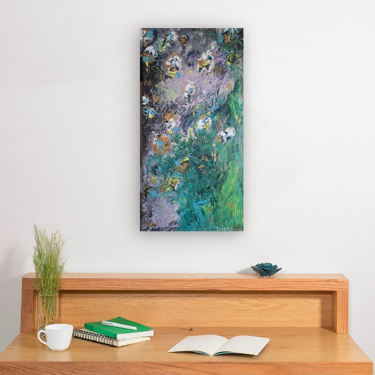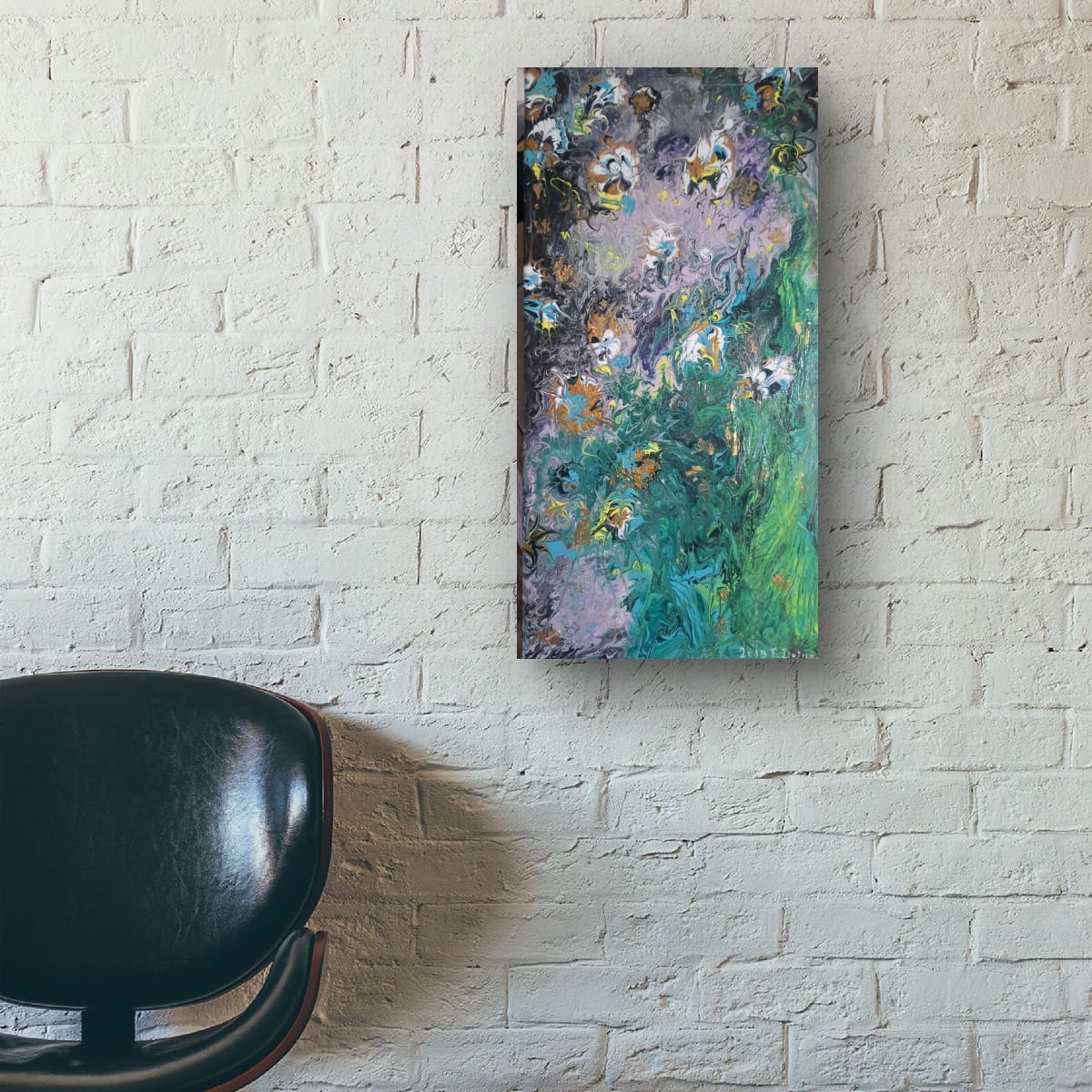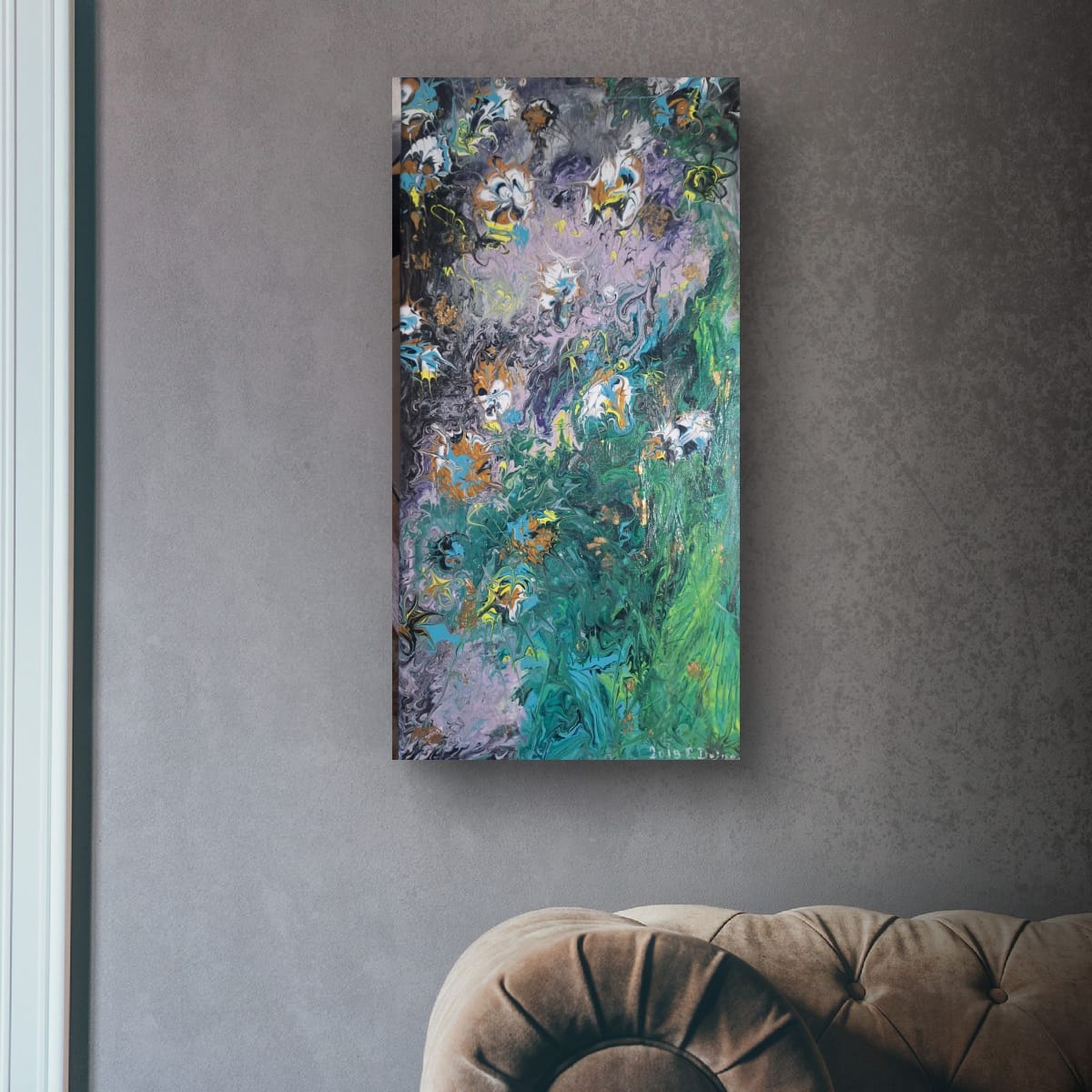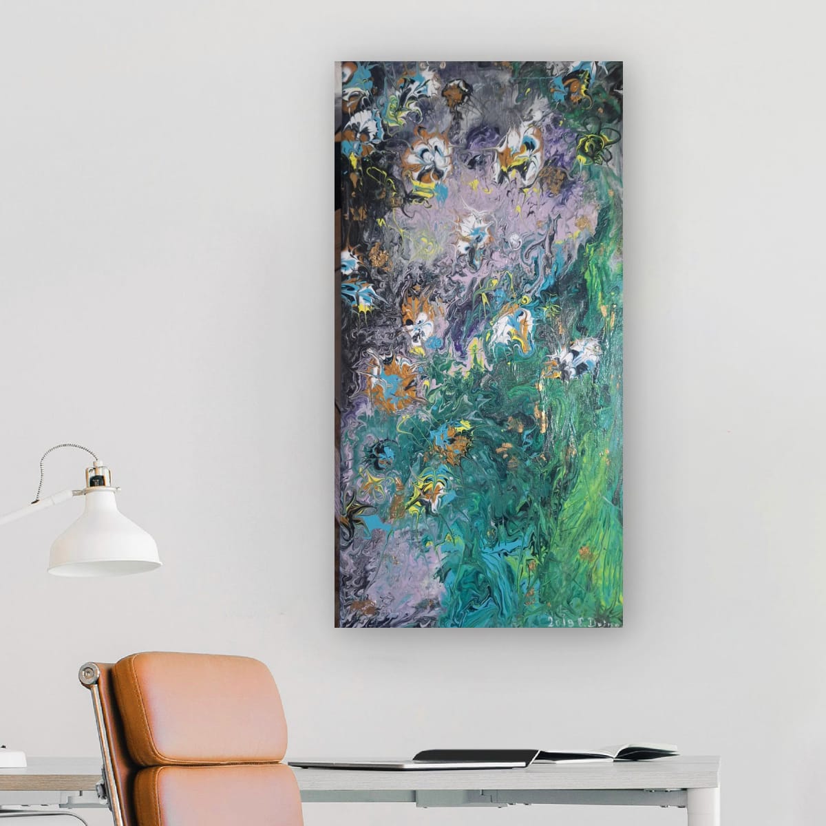"Emerald Cascade" is more than just a painting; it is a gateway to a vertical abstract landscape masterfully executed using the Pouring Technique. With its generous size of 40/ 70 cm, this artwork is truly designed to be the defining statement piece in any room.Dynamism and Color: The composition is marked by a spectacular flow, evoking the powerful essence of a cascade or a dense, lush garden. The deep, mysterious background in black and violet meets an intense rush of emerald green and vibrant turquoise. Subtle accents of gold and white throughout the piece mimic water foam or luminous petals.Visual Impact: This artwork offers a rich visual experience, inviting the viewer to explore its layers and depths of color. The dramatic contrast between the cool tones and the delicate, almost floral accents adds a touch of modern elegance and sophistication to your decor.Fine Art Details: This is a signed, unique original work. The edges are painted to extend the design onto the sides, and a professional hanging system is mounted on the reverse. The painting is ready for immediate display.