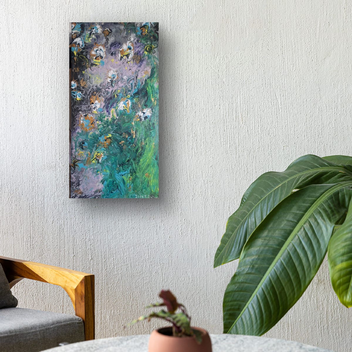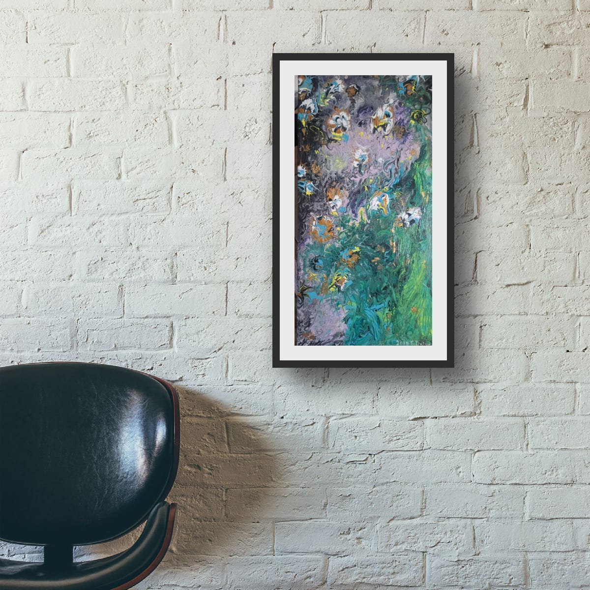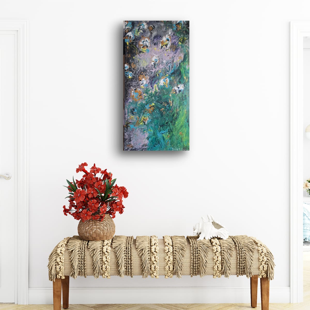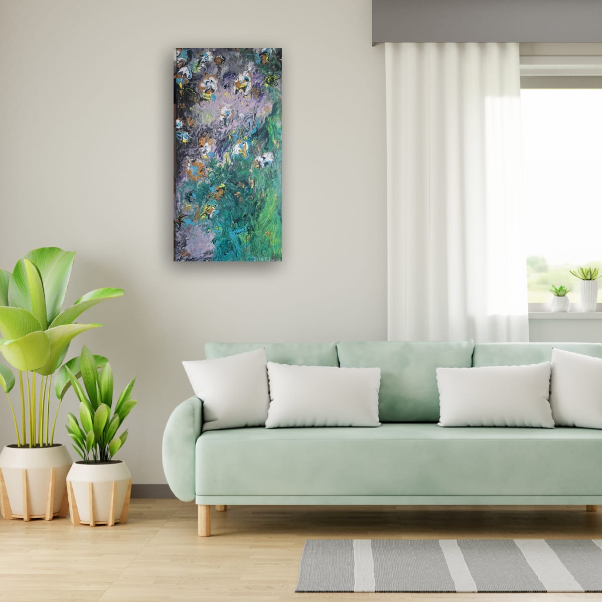 "Emerald Cascade" is more than just a painting; it is a gateway to a vertical abstract landscape masterfully executed using the Pouring Technique. With its generous size of 40/ 70 cm, this artwork is truly designed to be the defining statement piece in any room.Dynamism and Color: The composition is marked by a spectacular flow, evoking the powerful essence of a cascade or a dense, lush garden. The deep, mysterious background in black and violet meets an intense rush of emerald green and vibrant turquoise. Subtle accents of gold and white throughout the piece mimic water foam or luminous petals.Visual Impact: This artwork offers a rich visual experience, inviting the viewer to explore its layers and depths of color. The dramatic contrast between the cool tones and the delicate, almost floral accents adds a touch of modern elegance and sophistication to your decor.Fine Art Details: This is a signed, unique original work. The edges are painted to extend the design onto the sides, and a professional hanging system is mounted on the reverse. The painting is ready for immediate display.