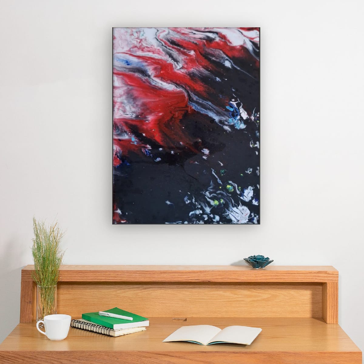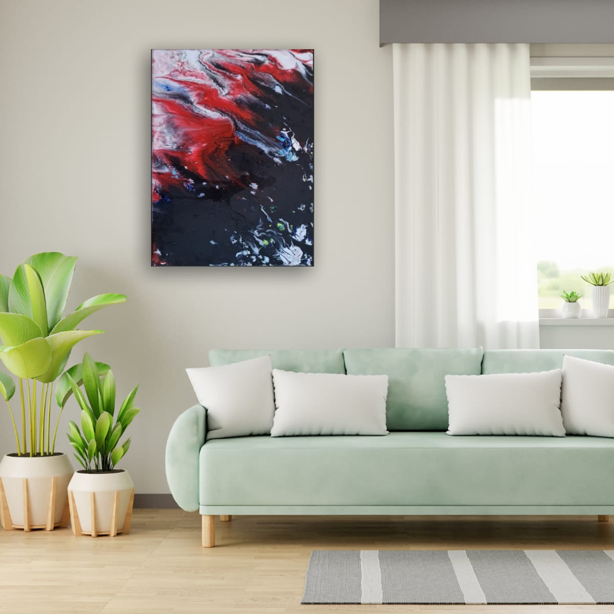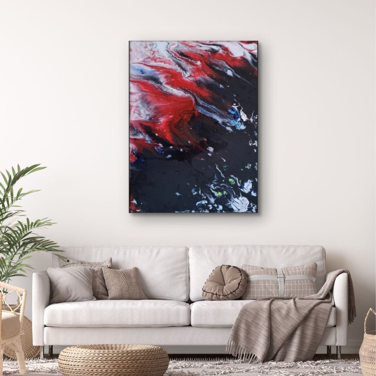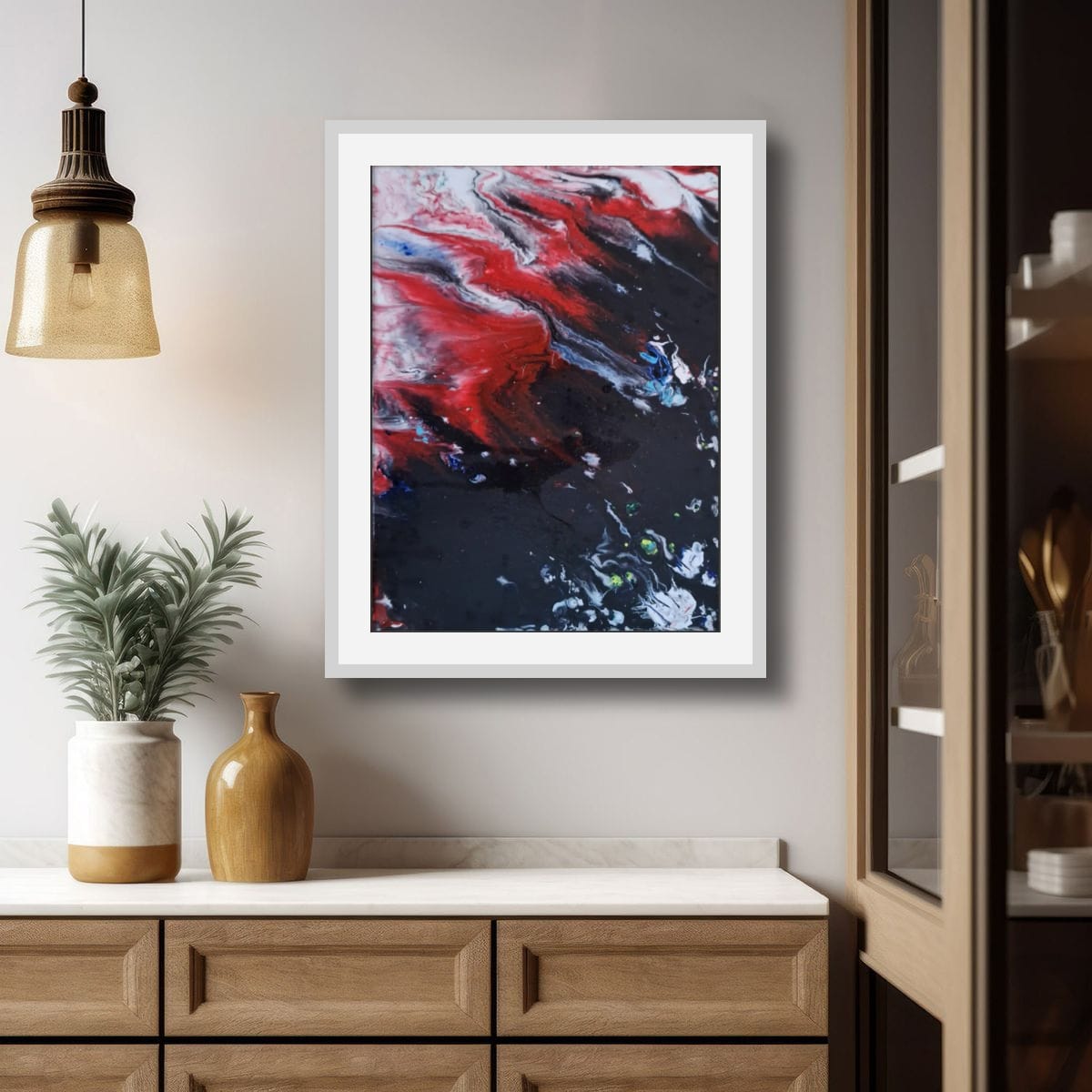 A striking contemporary abstract piece created using the fluid Acrylic Pouring technique, delivering intense visual energy. The strong contrast between the deep cosmic black and the vibrant waves of red, white, blue, and green suggests emotional release, inner struggle, or rebirth.