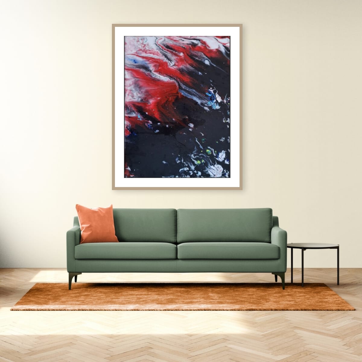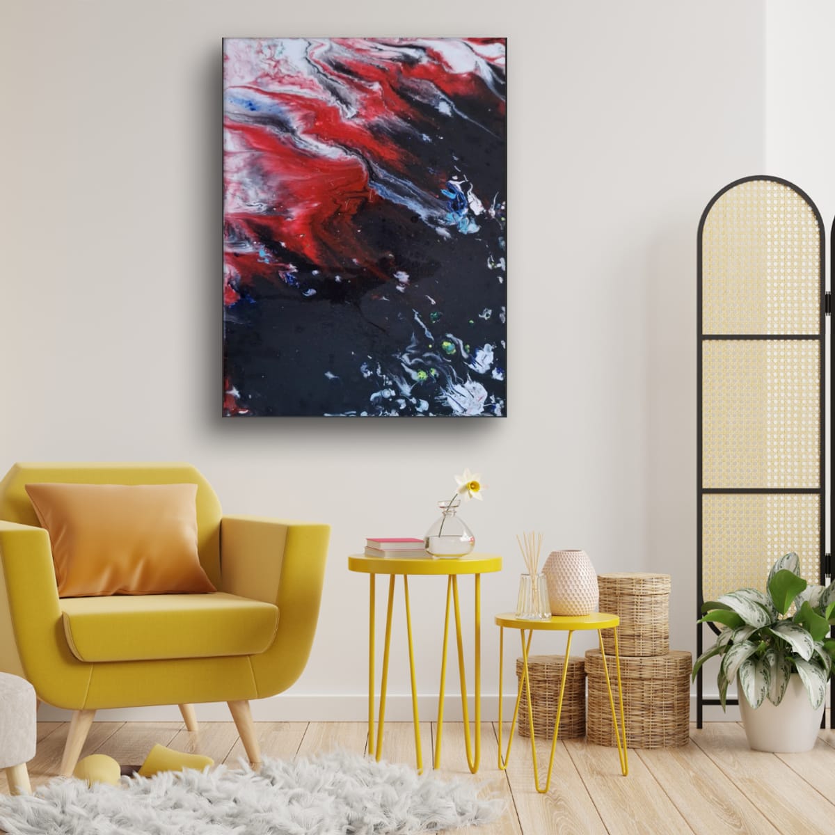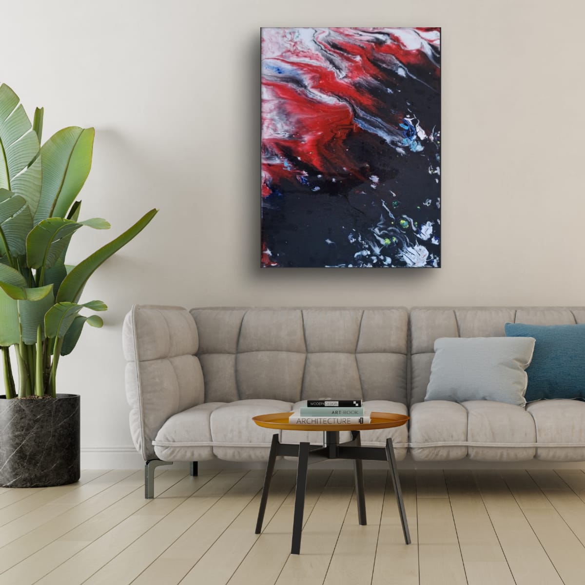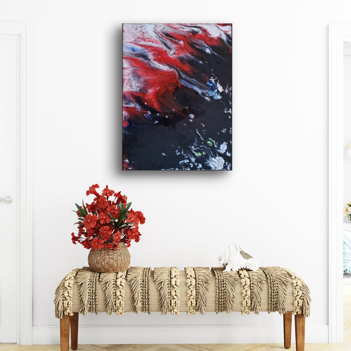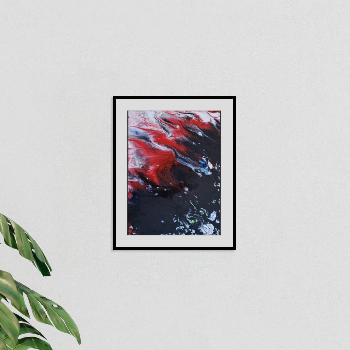 A striking contemporary abstract piece created using the fluid Acrylic Pouring technique, delivering intense visual energy. The strong contrast between the deep cosmic black and the vibrant waves of red, white, blue, and green suggests emotional release, inner struggle, or rebirth.