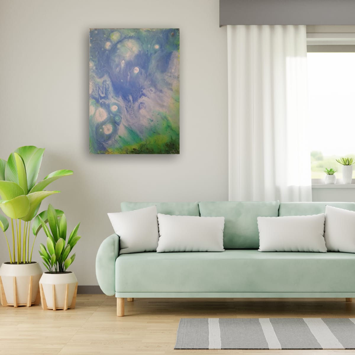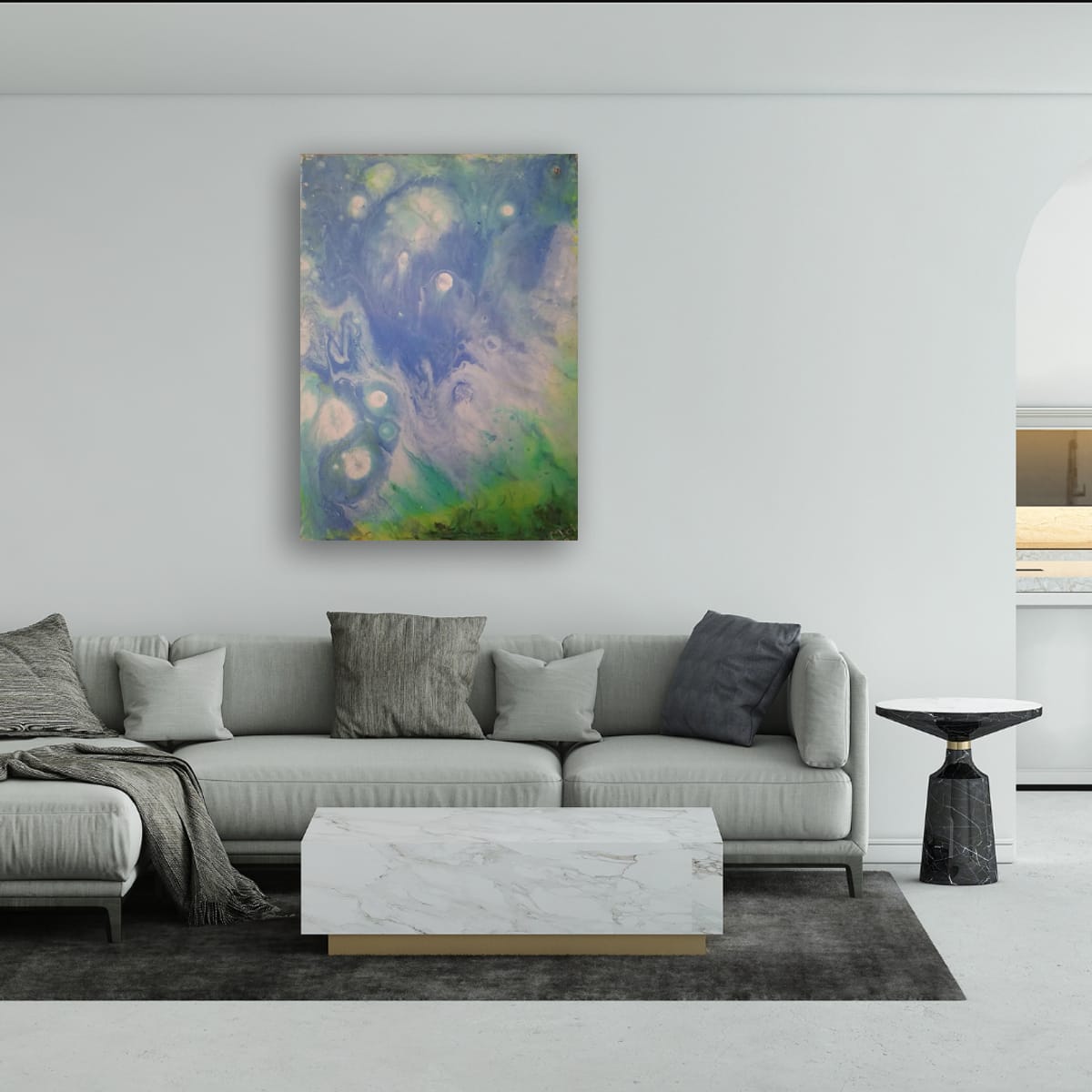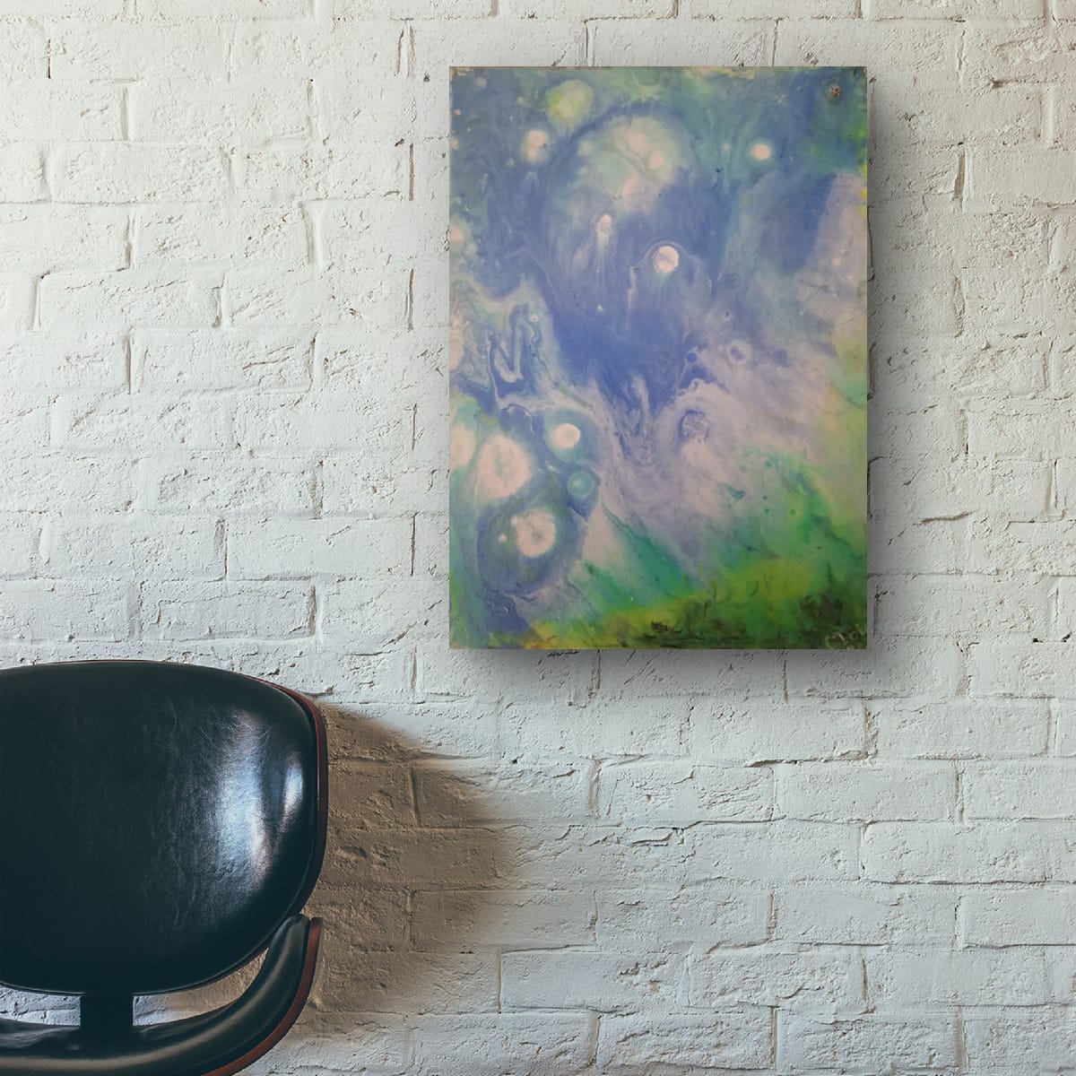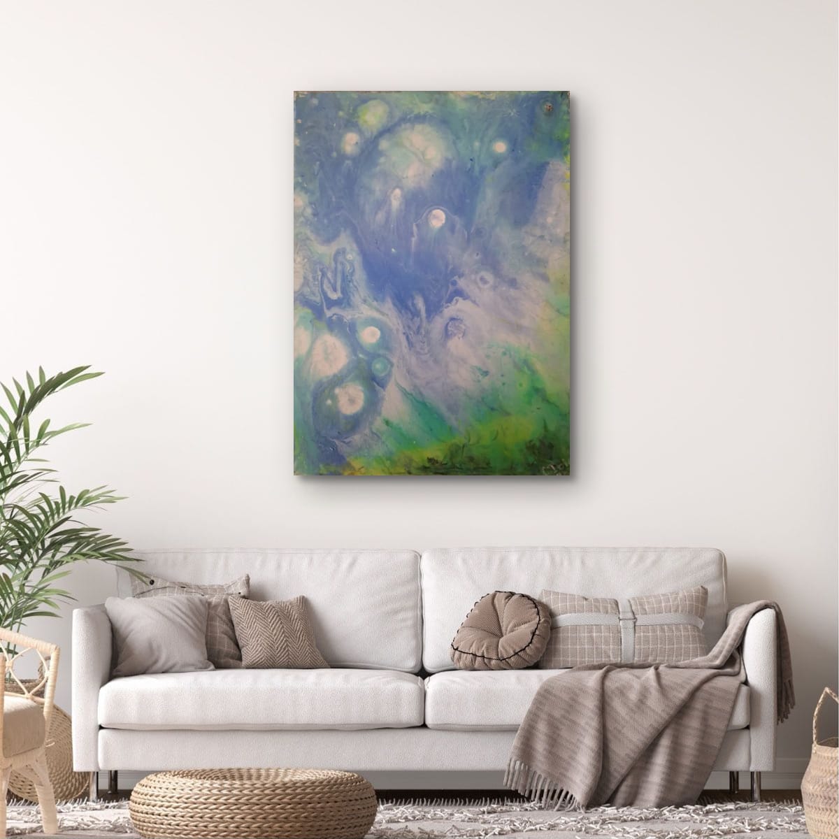I proudly present "Celestial Whispers," a unique abstract painting created using the mesmerizing Fluid Art (Pouring) technique. This piece is a harmonious fusion of celestial blues and vibrant greens, with delicate white accents that evoke an ethereal dance of light, reminiscent of tranquil waves or illuminated clouds in a dream.