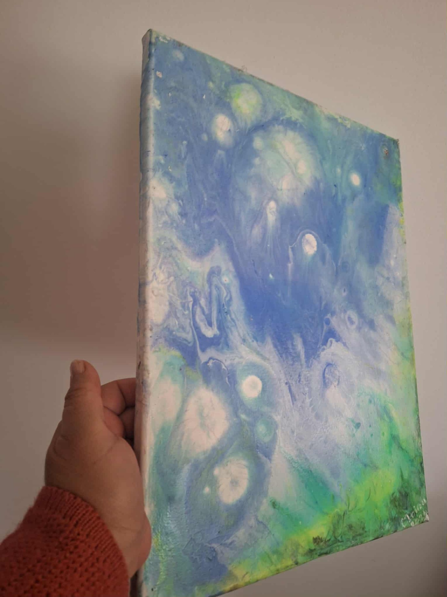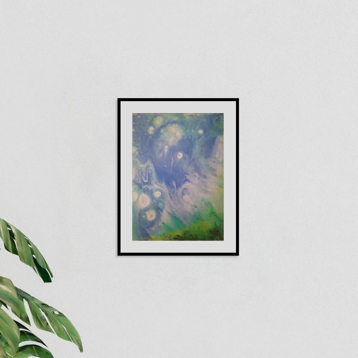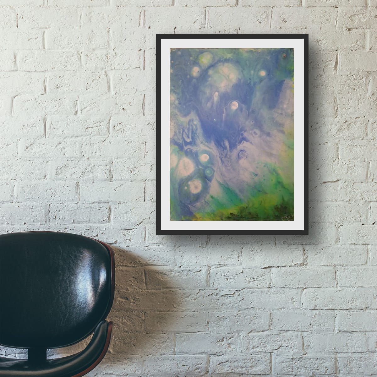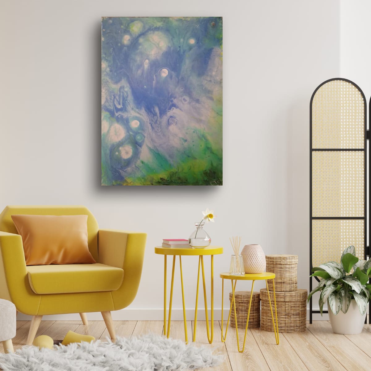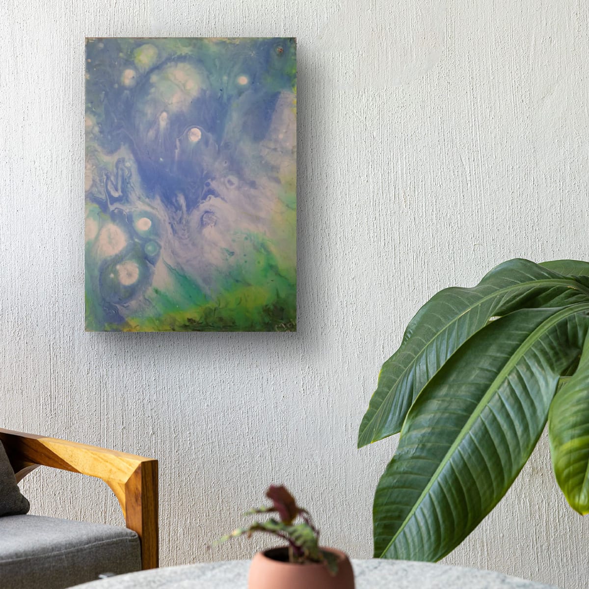 I proudly present "Celestial Whispers," a unique abstract painting created using the mesmerizing Fluid Art (Pouring) technique. This piece is a harmonious fusion of celestial blues and vibrant greens, with delicate white accents that evoke an ethereal dance of light, reminiscent of tranquil waves or illuminated clouds in a dream.