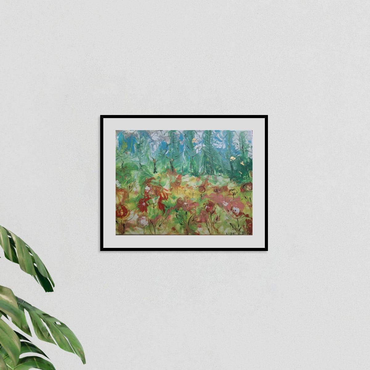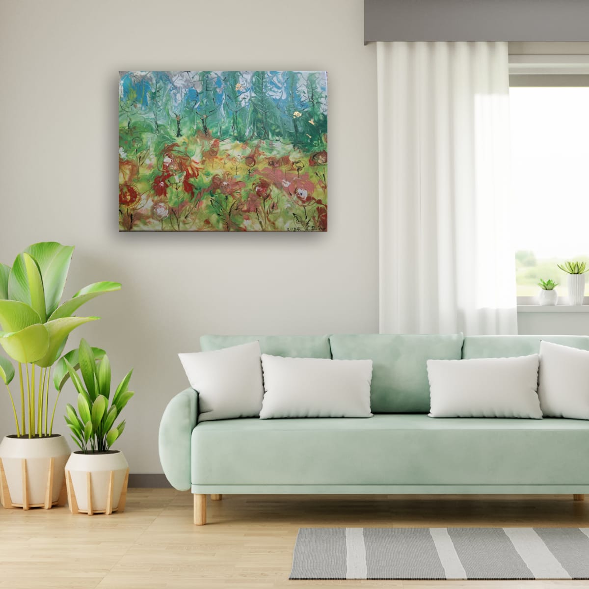The foreground is an abstract field of flowers painted with warmer brushstrokes in shades of yellow, red, and pink. This harmonious piece is full of light and life, perfect for bringing the joy of nature indoors.