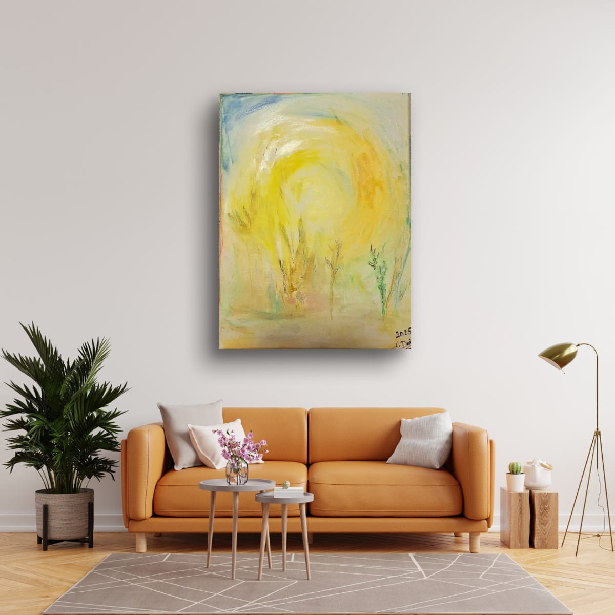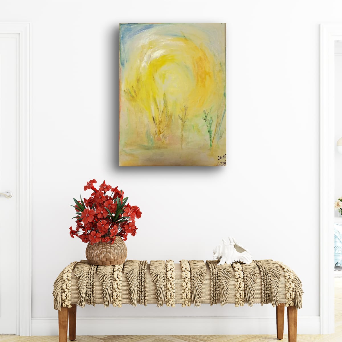 The artwork employs expressive brushstrokes, lending it an ethereal and hopeful quality. The canvas edges are painted, offering a clean, modern finish for immediate display. A hanging system is attached to the verso. The collector may choose to frame the piece or hang it unframed, according to their interior design preference.