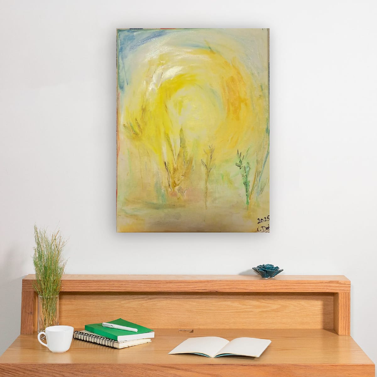 "'Light of Healing' is a profound and luminous original oil painting on canvas by artist Doina Cotfas, measuring 30x40 cm (approx. 12x16 inches). The piece captures an abstract burst of vibrant yellow and white, suggesting a powerful source of light, life, and renewal, with subtle green and earthy tones grounding the composition.