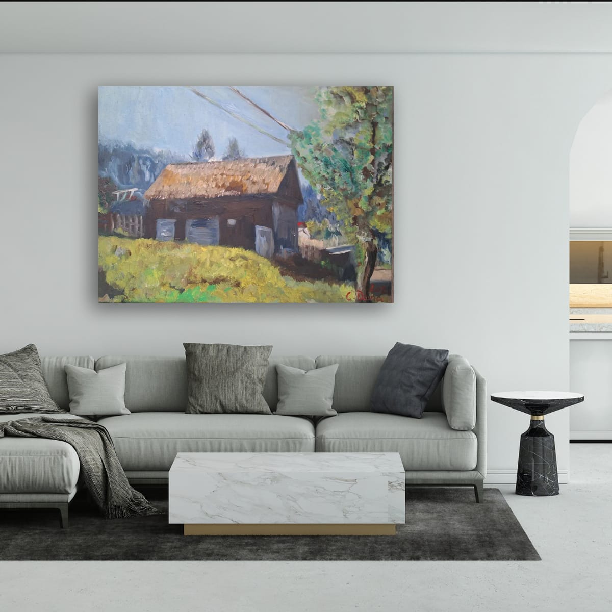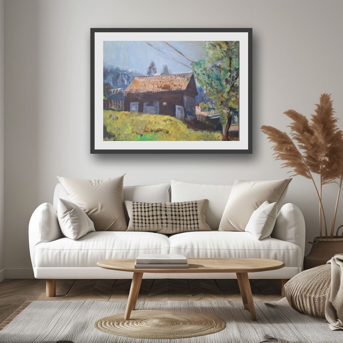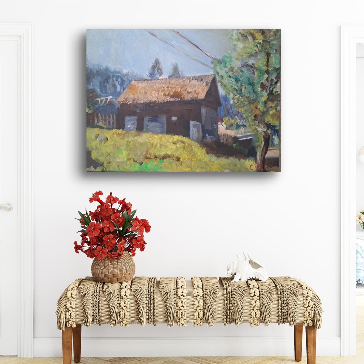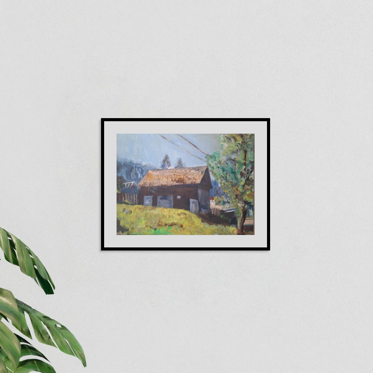 "The Village House" – A window to simplicity and an act of hope.This original oil painting, created by artist Doina Cotfas, captures the magic and nostalgia of an authentic rural landscape. The artwork features a traditional small house with a thatched or reed roof, nestled in a vibrant natural setting, complete with golden grass and a stately tree, lending a feeling of peace and a return to one's roots. This piece of art is guaranteed to bring the warmth and authenticity of country life into your space.